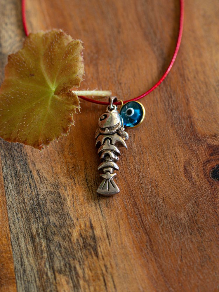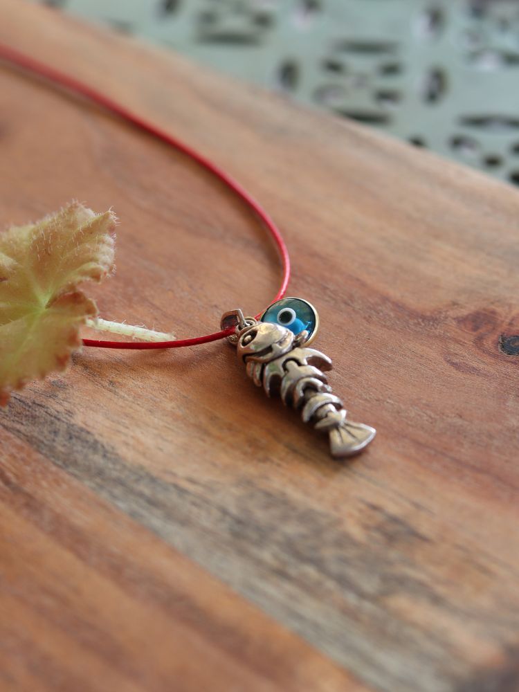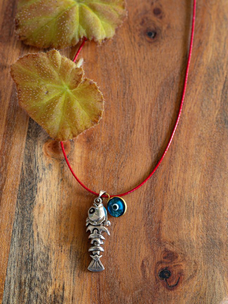 חומרים- תליון שרשרת: הדג מכסף מלא. שרשרת: חוט עמיד מאוד אורכו כ-60 ס”מ והוא נסגר בקשר גולמי.