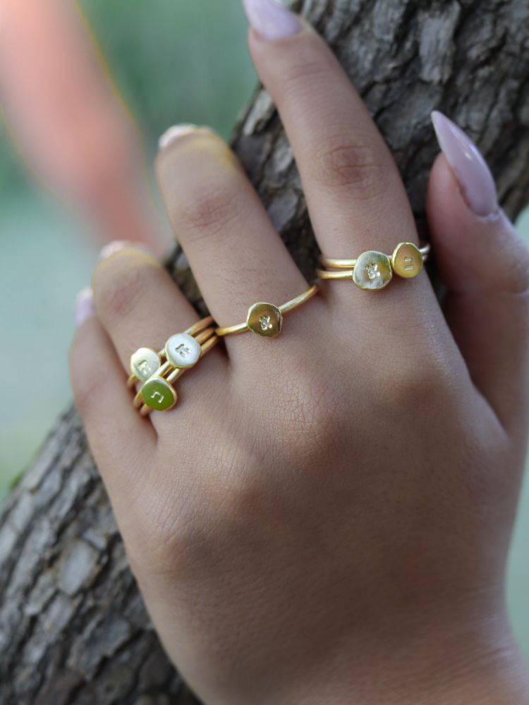 סדרת טבעות ולכל אחת אות קטנה משלה שאפשר לענוד כאחת קטנה עדינה לבד עד 3 ו4 ביחד עם כל האותיות של כל החמולה 🙂